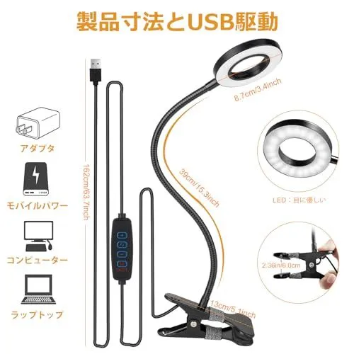 USB給電 -- USB多機能クリップライトは、コンピュータ、5V 2A以上の安全認証を受けたUSBウォールチャージャー、モバイル電源、アダプターなど、USBポートをサポートするほとんどのデバイスに対応しています。長さ1.6mのUSBケーブルで、長時間の遠隔給電を便利に楽しむことができます。 注:ライトが暗くなったり点滅したりしない場合は、認証基準を満たした別の充電器をお試しください。
