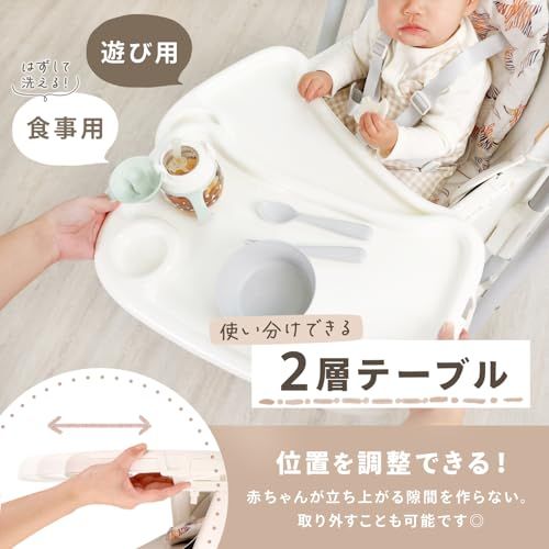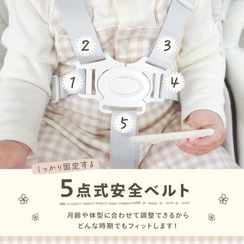 【快適&安全に使える便利な機能】 リクライニング機能を搭載しており、赤ちゃんが疲れたらそのままお昼寝が可能。キャスター付きで移動もラクラク、ストッパー付きでしっかり固定できます。5点式安全ベルトでしっかり固定でき、足置き場も角度調整可能なので、正しい姿勢をサポート。さらに、テーブルの位置調整ができるため、安全性を確保しながら食事や遊びを楽しめます。