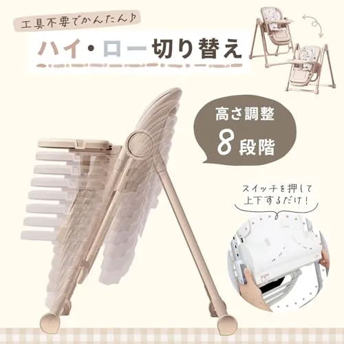 【仕様】ハイとローの切り替え、2層テーブル、リクライニング、足置き場、折り畳み式、5点式安全ベルト、キャスター、ゆりかご