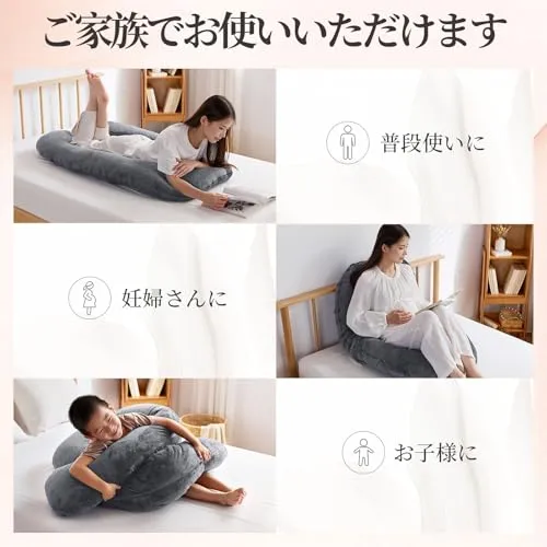 【全身をやさしくサポート】頭から脚まで、体全体を包み込むようにサポートします。横向きの姿勢でも体の軸を自然に保ち、妊婦の方にも使いやすい設計です。楽な横向き寝を実現する抱き枕です。