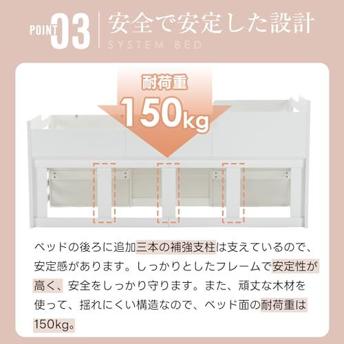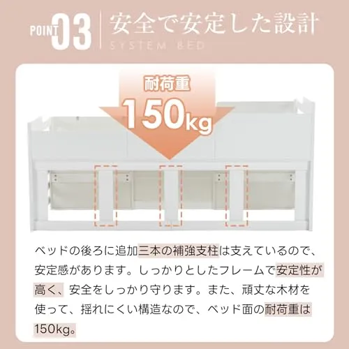【安全で安定した設計】ベッドの後ろに追加三本の補強支柱は支えているので、安定感があります。しっかりとした木製フレームで安定性が高く、安全をしっかり守ります。また、頑丈な木材を使って、揺れにくい構造なので、ベッドの耐荷重は150kg。