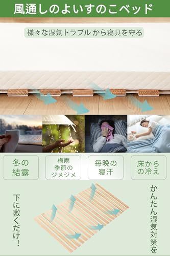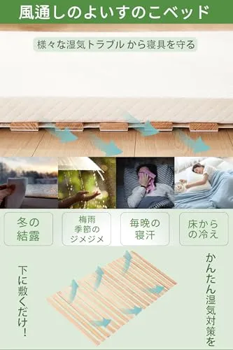 【優れた通気性】布団やベッドマットレスの下にスラットベッドを1つ敷くと、その下に風の通り道を作って,通気性がUPし、お布団を湿気から守ります。梅雨時のジメジメ、冬のカビ、イエダニ、結露を防ぎ、オールシーズン快適に睡眠できます。