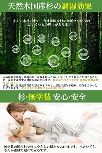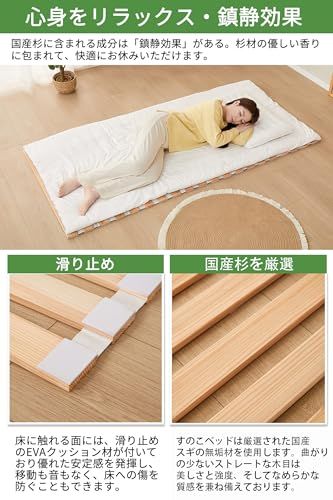 【厳選された国産杉】すのこベッドは無垢の国産杉材を使用しております。まっすぐに成長する「杉」の木目は直線的で美しい。多くの天然の油・ヤニを含むため爽やかで心地よい香りを放ちます。杉の芳しい香りは空間全体を包み込み、リラックス効果をもたらします。さらに、通気性や防水性、耐久性も高い木材です。