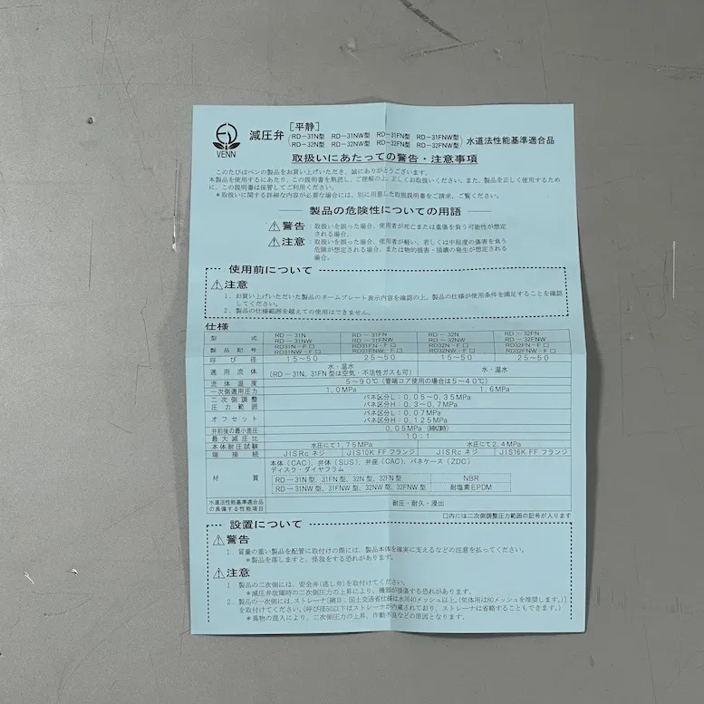 【商品の説明】 ブランド、メーカー:ベン 型番:RD31N-FL 0.05~0.35Mpa 水用 液体用 戸別給水用 安定した圧力制御を実現する減圧弁「平静」シリーズ。 呼び径40で中~大口径配管に対応。 機器や配管の保護に貢献し、設備の長寿命化をサポート。 #ベン #減圧弁 #平静 #RD31NFL #呼び径40 #配管部材 #バルブ #給水設備 #給湯設備 #住宅設備 #未使用アウトレット #アウトレット建材 #圓屋 #圓屋アウトレット