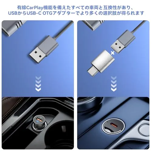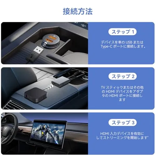 【使用上の注意】 ? 有線CarPlay接続に対応した車両のみ対応しており、無線CarPlayには対応していません。 ? 本製品単体ではアニメやテレビを視聴することはできません。別途テレビプレーヤーまたは地上デジタルチューナーが必要です。 ? 本製品のUSBポートはタッチコントロール用ポート(Fire TVのタッチ操作など)ですので、Fire TV Stickの電源を本製品のUSBポートに接続しないでください。Fire TV StickはシガーソケットまたはUSB電源に接続するか、他のUSBポートで給電してください。 ? USB変換(AC)コネクタが付属しており、USB Type-A/Type-C車両に対応します。 予防 ※Fire TV Stickの電源アダプターを本製品のUSBポートに接続しないでください。Fire TV Stickをシガーソケット電源USB変換電源、またはその他のUSBポートに接続して電源供給してください。※