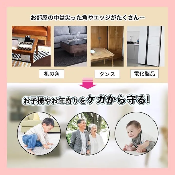 このコーナーガードは、転倒しやすい赤ちゃんや小さなお子様、お年寄りをケガから守るための必須アイテムです。