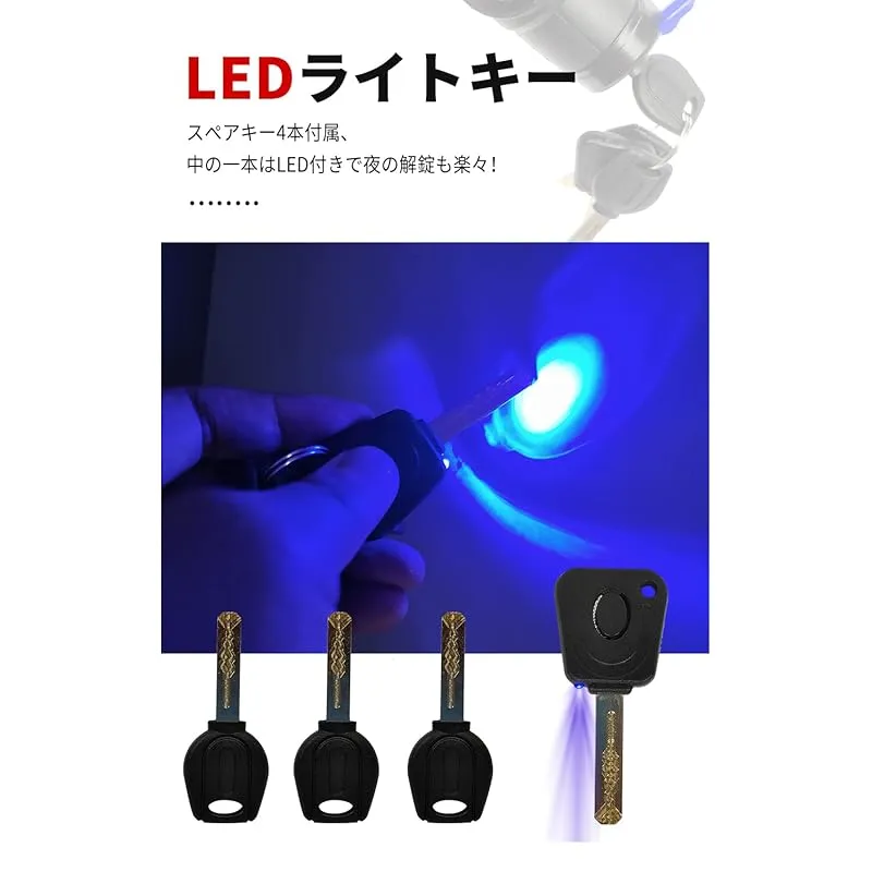 【防盗キー四本付属】車によく使われているウェーブキーを採用しており、コピーや合鍵の作成はかなり時間とコストがかかりキータイプで、抜き差しがスムーズです。四本のキーの中一本はLEDライト付きです。キーは摩耗する物なので、スペアキーを四本ご用意しました。1500mm・1800mmの二つのバリエーションがありますので、自転車・バイク・原付など適用範囲が広いです。