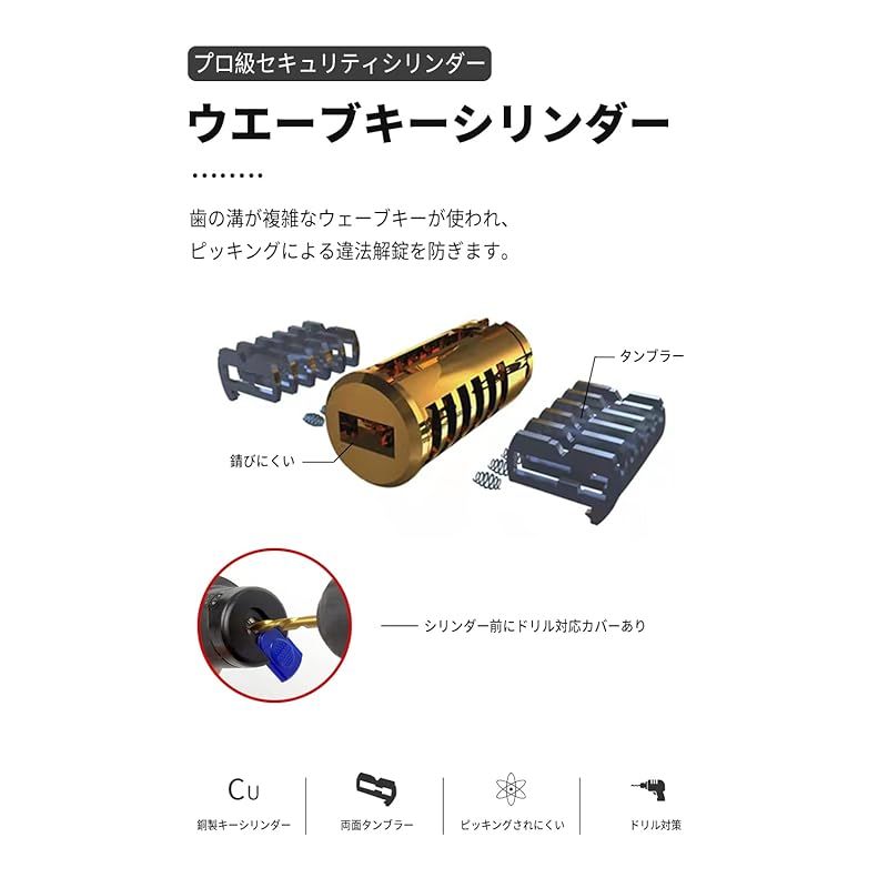 【防盗シリンダー】ウェーブキーシリンダを採用しており、タンブラー数が多く、ピッキングしにくく、プロの窃盗でも開けるにはかなりの手間がかかります。更に鍵穴には金属カバーがあるため、ドリルによる解錠の対策もバッチリです。