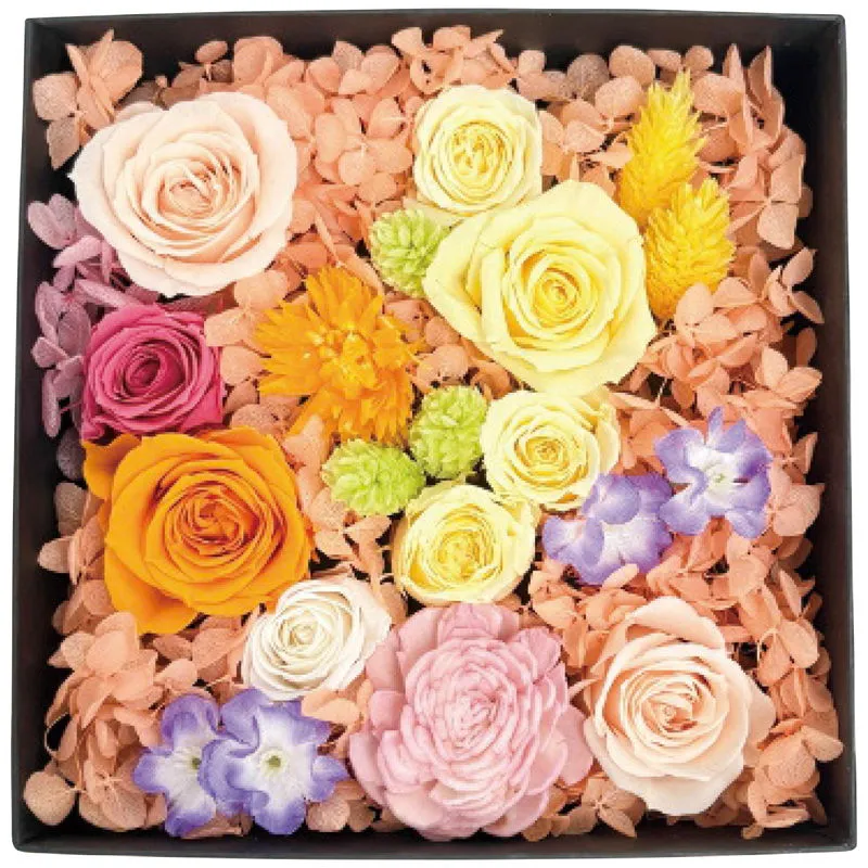 【商品について】 プリザーブドフラワー ジャルダン・フルリ トロピカル (2026-pr-tr-op[トロピカル]) 高級感のある紙製ボックスの中は枯れないお花の庭園。生花を特殊な溶液につけ保存加工したプリザーブドフラワーは洗練された繊細さと美しさを表現してくれます。クリアな蓋付き。