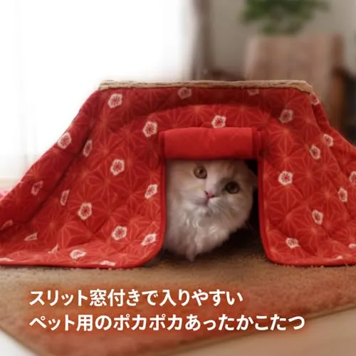 ちょうどいい温度のぽかぽかこたつ!中も上もあたたかい こたつの中央温度は約30度!ちょうどいい温度設計の犬猫こたつ。 スリット窓で中に入りやすいから簡単に出入りができます。
