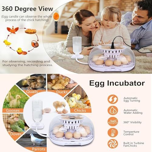 【孵卵器広い適用範囲】初心者の方でも使いやすいです。研究室、教学授業、家庭、実験室、子供教育などに適用性があります。子供たちは孵卵プロセス全体についてより多く学び、子供たちの好奇心を育むことができます。お子様と一緒にひよこを孵化させて観察したり、生き物の命の尊さを学ぶ教材として当製品はおすすめです。 透明度の高いカバー。いつでも蓋を開けて孵化過程を見る必要はありません。注意:発泡箱を捨てないでください。室内温度が21未満の場合は、温度を維持するために発泡箱を使用する必要がある。