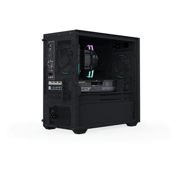 ●妥協なき冷却性能 AORUS PRIME 3 は、高負荷時でも冷却性能を維持できるよう設計されています。トリプルファンのフロント吸気が 80% メッシュ構造のフロントパネル から大量のエアフローを取り込み、高性能エアクーラーが激しいバトル中でも CPU を安定した温度に保ちます。