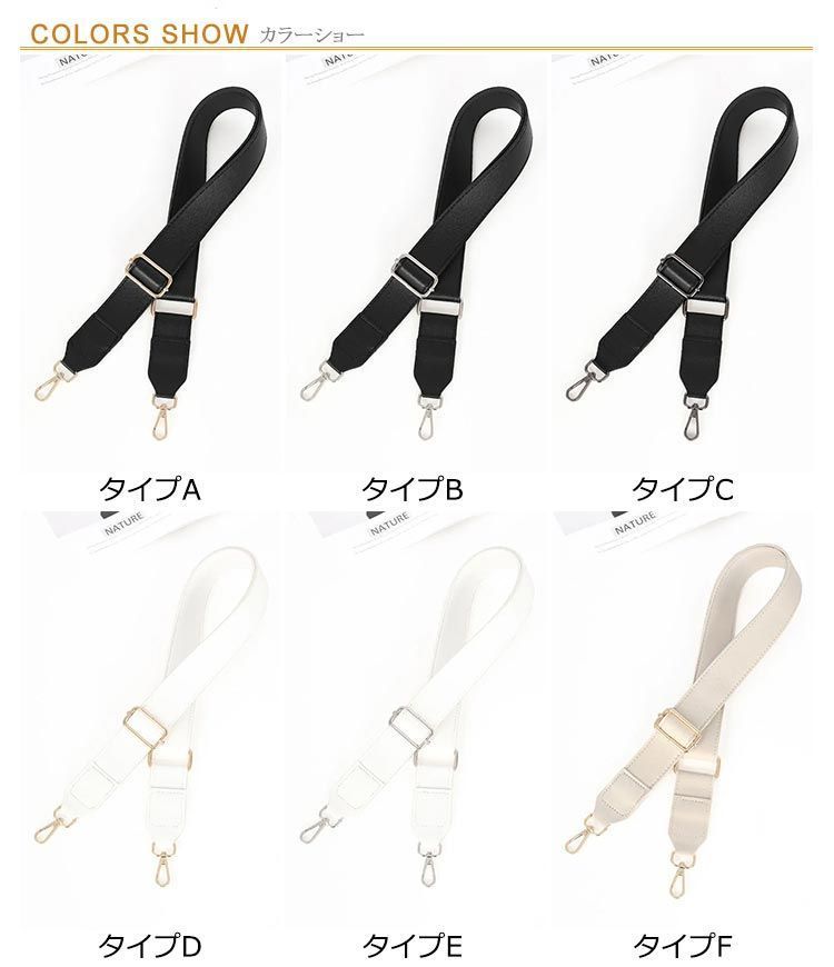 ■こちらの商品は沖縄・離島は配送料が異なります。 ご購入前にお知らせください。 お住まいの地域に合わせた専用ページを作成いたします。 商品特徴 全20タイプ!バッグを着せ替えて楽しめるショルダーベルトです。 お持ちのバッグに付け替えるだけで、あっという間にお洒落に大変身。 * ベースベルトには、厚みのあるしっかりとしたPUレザーを使用。 * カジュアルにもキレイめにも合わせやすく、いつものコーディネートをワンランクアップ。 * 幅広ストラップで肩にかけても疲れにくく、使い勝手の良い万能アイテム。 * 肩に掛けずに垂らして使うだけでも、バッグに可愛らしさをプラスします。 仕様 * サイズ: F * サイズ詳細: 幅 3.8cm、長さ 83〜135cm ※サイズは平置き実寸です。 ※商品によりサイズ表記に1〜3cm程度の誤差が生じる場合がございます。 * 素材: ポリエステル * カラー: タイプA、タイプB、タイプC、タイプD、タイプE、タイプF、タイプG、タイプH、タイプI、タイプJ、タイプK、タイプL、タイプM、タイプN、タイプO、タイプP、タイプQ、タイプR、タイプS、タイプT プラス配送料の目安 沖縄・離島 +2,000円