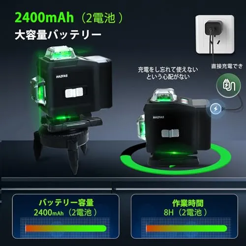 【2つの充電式バッテリーパック、L字型支持台。室内外兼用】付属のL字型軽量取り付け支持台は位置微調整が可能で、作業中の位置調整に適しています。2つのバッテリーパックが付属しているため、作業に集中し、簡単で効率的なタスクを完了できます。レーザー墨出し器の作業がよりスムーズになります。バッテリーパックの交換も簡単で、長時間の作業にも対応できます。レーザー墨出し器は、プロの作業者にも最適です。