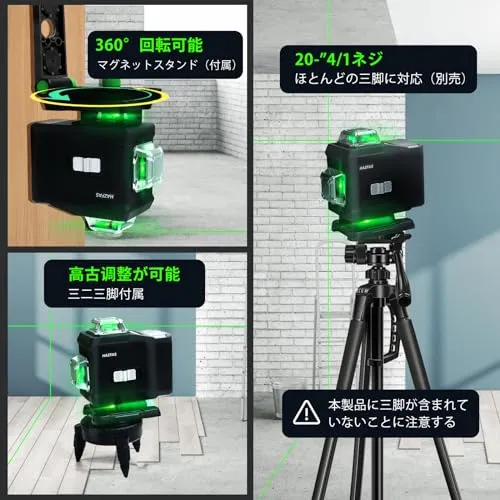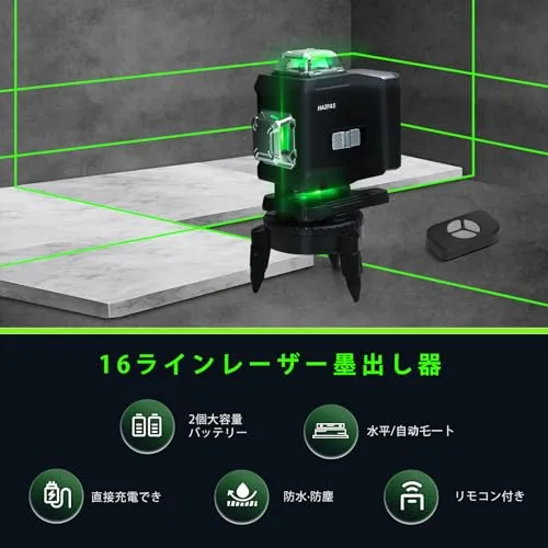 レーザー墨出し器、墨出しレーザー、4Dグリーンレーザー墨出し器、4x360°、水平器 レーザー ビルドとアライメント用、充電式バッテリー、リモコン、磁気回転スタンド レーザー安全基準:クラス2 16ライン 16X-A★tm
