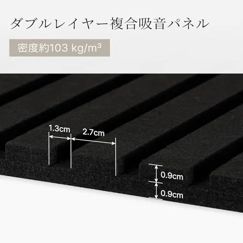 ダブルレイヤーで吸音効果アップ:この吸音パネルは高密度防音材を採用し、ダブルレイヤー複合デザインにより、騒音をしっかりと吸収し、反響音やノイズを効果的に低減します。一般的な吸音パネルと比較して2倍の吸音効果を実現し、室内の音環境を快適に整えます。さらに、素材は1800g/に達し、密度と厚みを兼ね備えた高品質設計で、効率的に音の反射や伝達を抑えます。