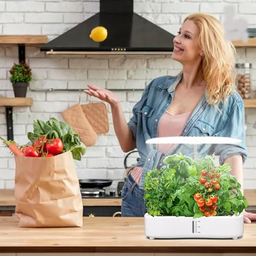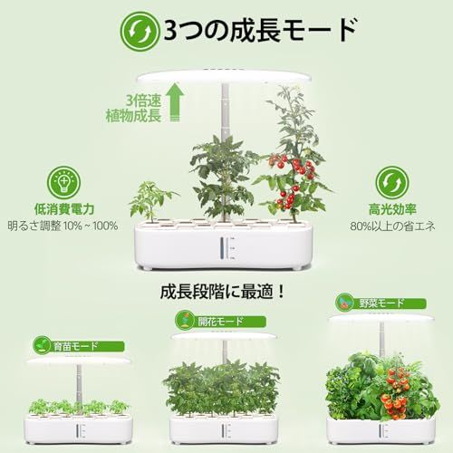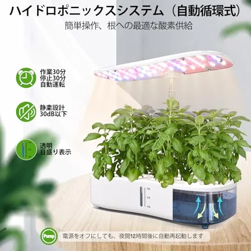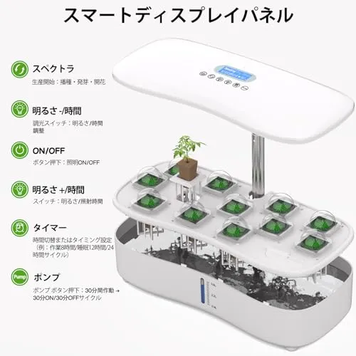 水耕栽培キット、LED植物成長ライトとスマートディスプレイを搭載し、簡単に操作できます。自動水循環システムとタイマー機能により、3つの栽培モードが提供され、12種類の植物を栽培できます。栽培キットの高さと照明明るさは、植物の成長段階に応じて調整可能。これにso