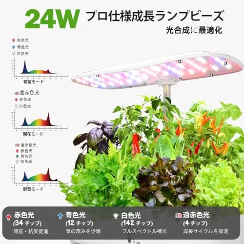フルスペクトルLED水耕栽培キット: 高性能24ワットLEDライトを搭載した水耕栽培キットで、太陽光を完璧にシミュレート。植物の光合成を促進し、最大5倍の速度で成長。自動タイマー機能で日の出と日の入りを再現し、家庭菜園を手軽に楽しめます。