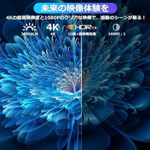 【30,000ルーメン超高輝度 ― 明るい部屋でも鮮明な投影】 驚異の30,000ルーメンの明るさで、昼間や照明が明るい場所でもくっきりとした投影を実現!最適化された光学エンジンと高効率LEDが、長時間使用しても輝度やコントラストをしっかり維持し、色彩や明暗を自然に再現します。明るい場所でも、最高の映像体験をお届けします。