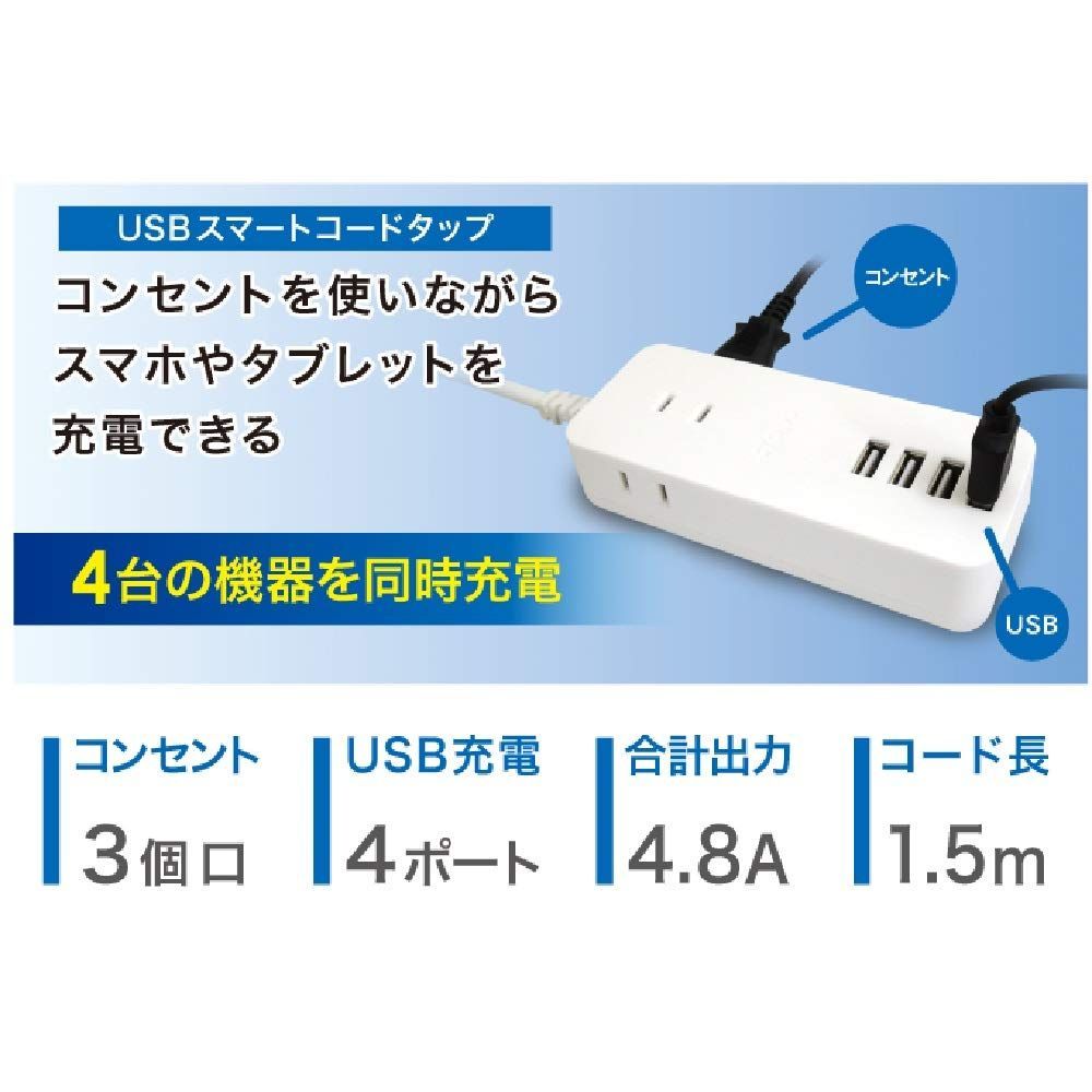 1.5m USB4ポート 急速充電 AC3個口 オートパワーシステム搭載 延長コード 電源タップ ホワイト USB TPU15-WT トップランド