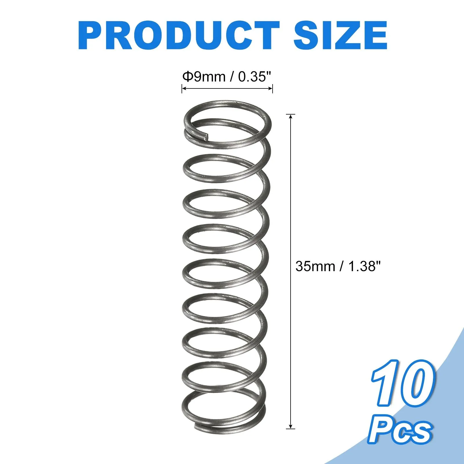 >製品サイズ:圧縮コイルスプリング10個入り。外径9mm、線径0.8mm、自由長35mm。