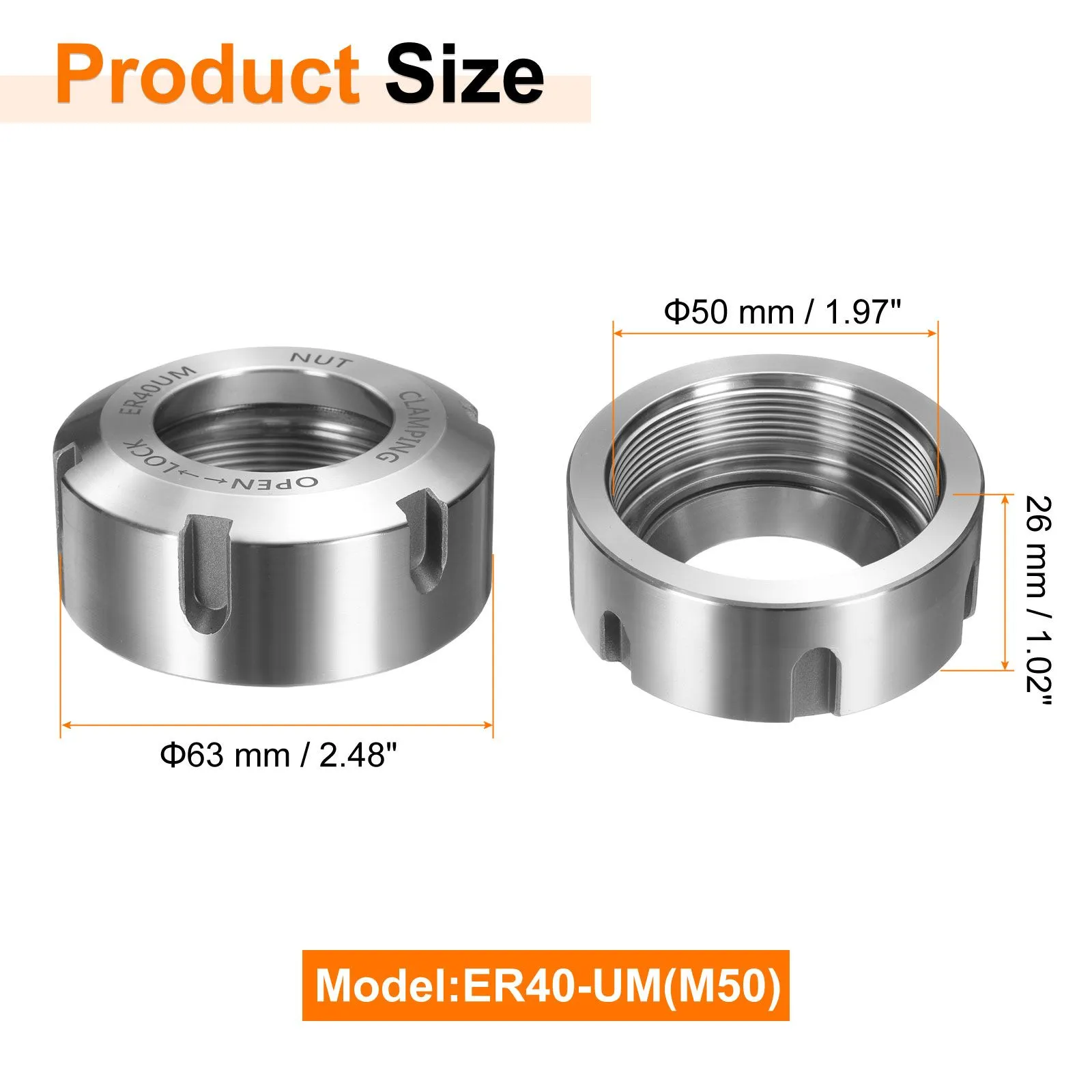 サイズ - ER40-UM(M50); ネジ 径: 50 mm / 1.97"; ピッチ: 1.5 mm / 0.06"; ナット 外径: 63 mm / 2.48"; 厚さ: 26 mm / 1.02"。