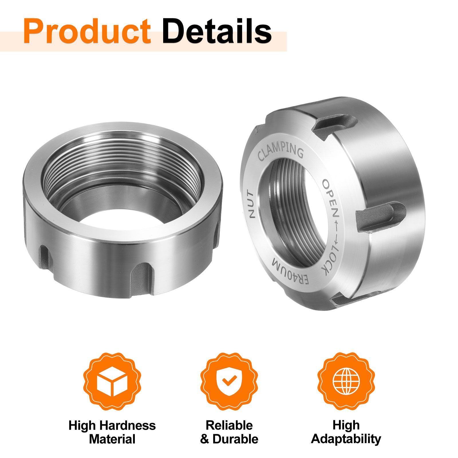 1. 40Cr 合金 鋼 製 (硬度 HRC48-50) で、高 強度 と 耐久性 を 備え て います。熱 処理 により、過酷 な 環境 でも 信頼性 が 確保 され ます。 2. 互換性 の 高い 交換 用 パーツ です。ER タイプ 工具 ホルダー、エクステン ションバー、ドりルビット、ボーリングツール など の ほとんどの 工具 ホルダー に 適合 します。 3. CNC 旋盤、フライス盤 など の 工作 機械 で 使用 可能 です。切削 工具 を 確実 に 固定 し、加工 時の 精度 と 安定性 を 保証 します。機械 加工、金属 加工、自動車 製造 など 幅広い 産業 で 活用 され ます。 4. ナット を 締め 過ぎる と コレット が 破損 する 可能性 が ある ため 注意 が 必要 です。定期的 に 摩耗 や 緩み を チェック し、ダメージ した 部品 は すぐ に 交換 して ください。