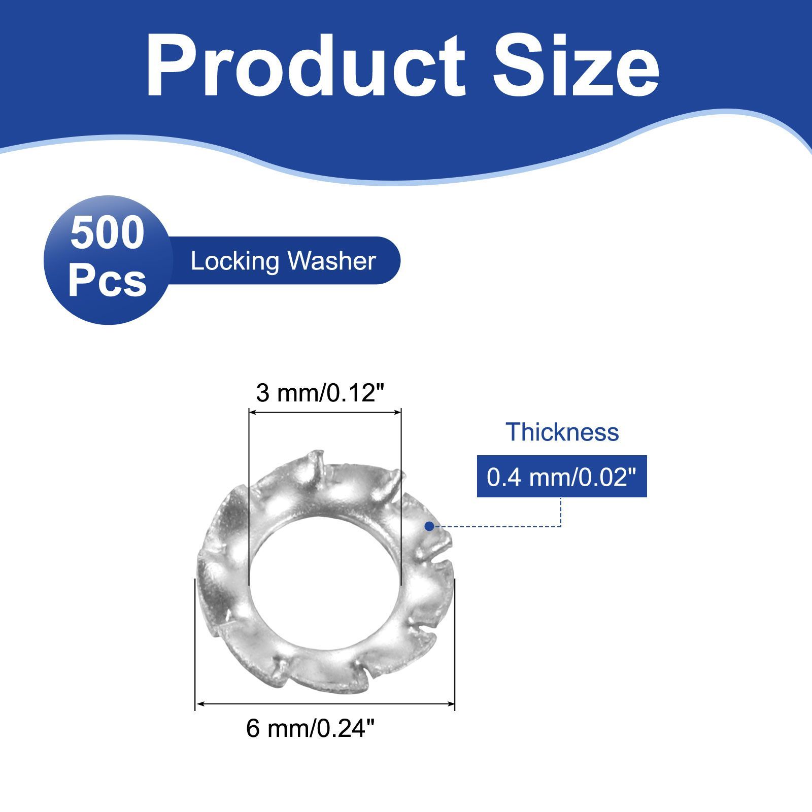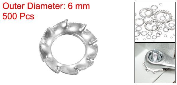 [サイズ&パッケージ]: サイズ: 内径: 3 mm/0.12インチ; 厚さ: 0.4mm/0.02インチ; 外径: 6mm/0.24インチ; パッケージ: 外歯座金 500個