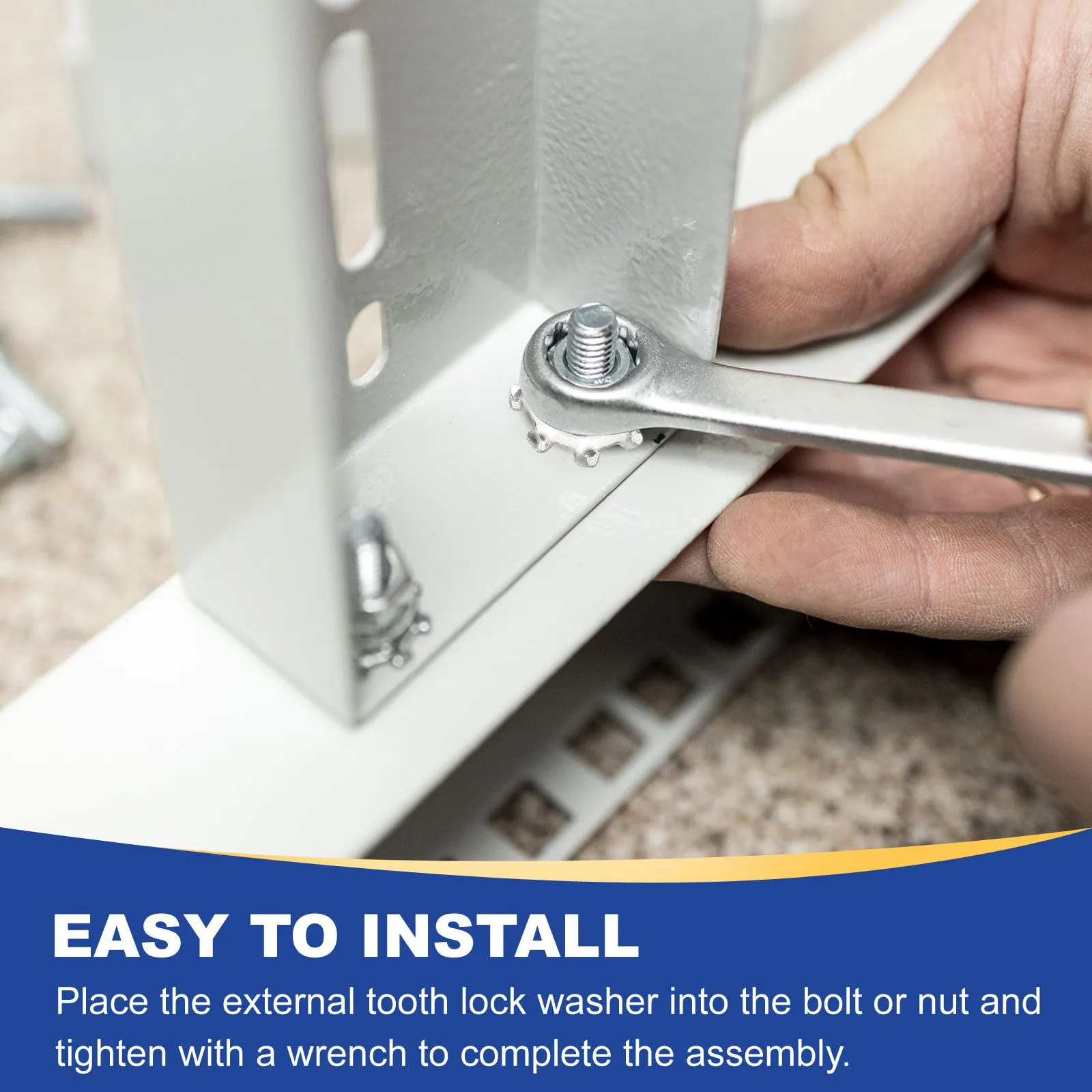 [簡単取り付け] - ボルトやナットのサイズに合わせて適切な外歯座金を選び、接触面に外歯を噛み合わせた後、レンチでナットまたはボルトを締めるだけで取り付け完了です