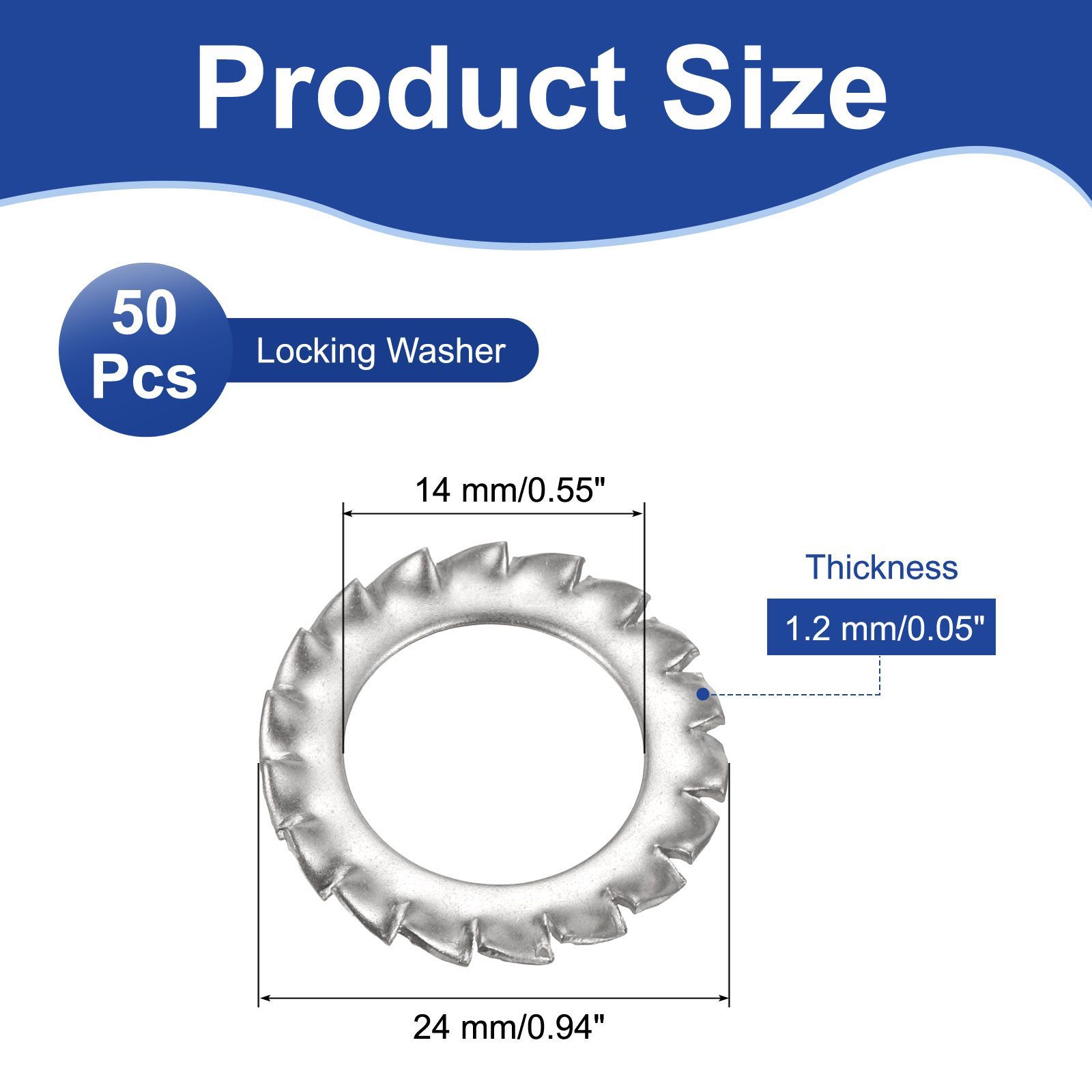 [サイズ&パッケージ]: サイズ: 内径:14mm/0.55インチ; 厚さ:1.2mm/0.05インチ; 外径:24mm/0.94インチ; 内容量:ロッキングワッシャー50枚入り