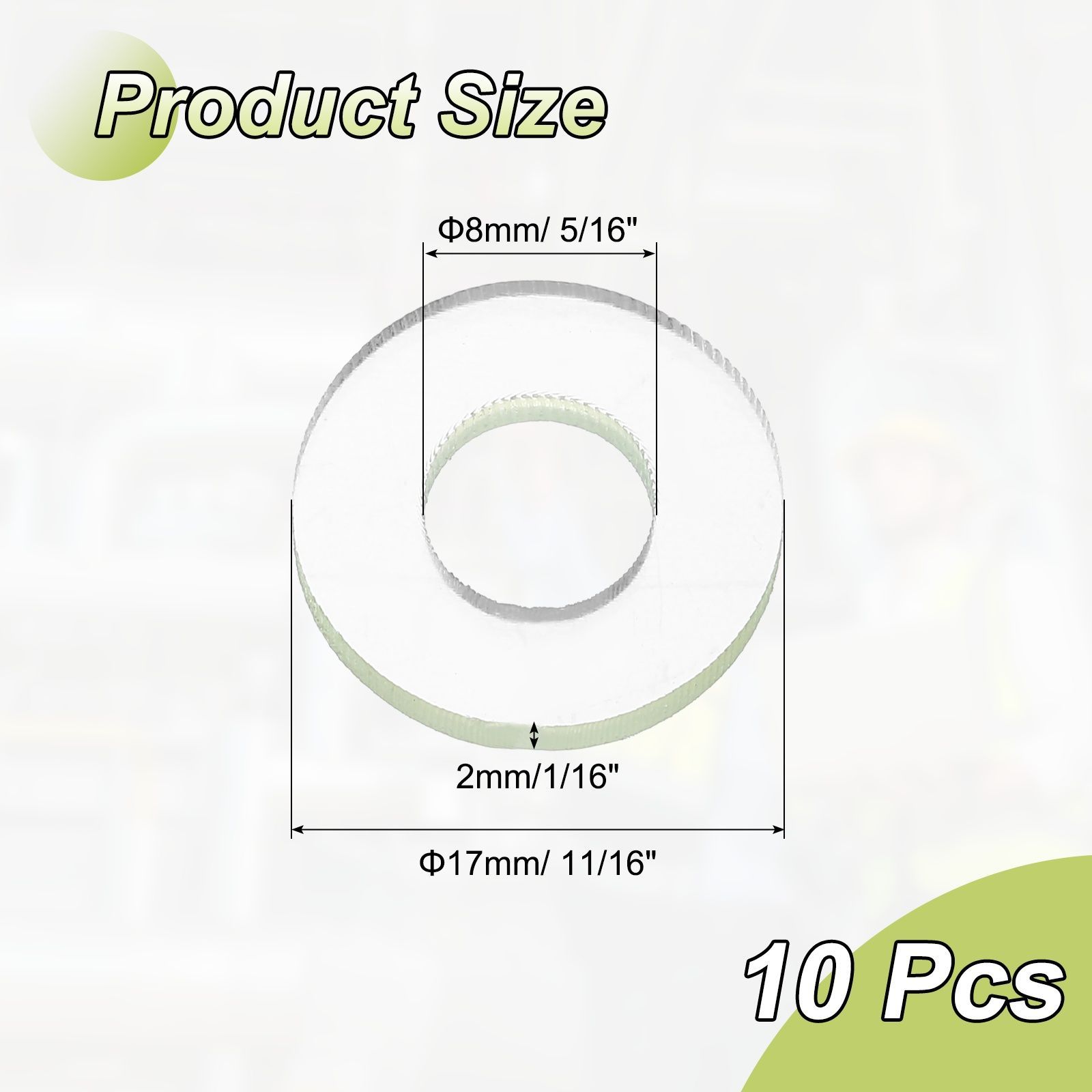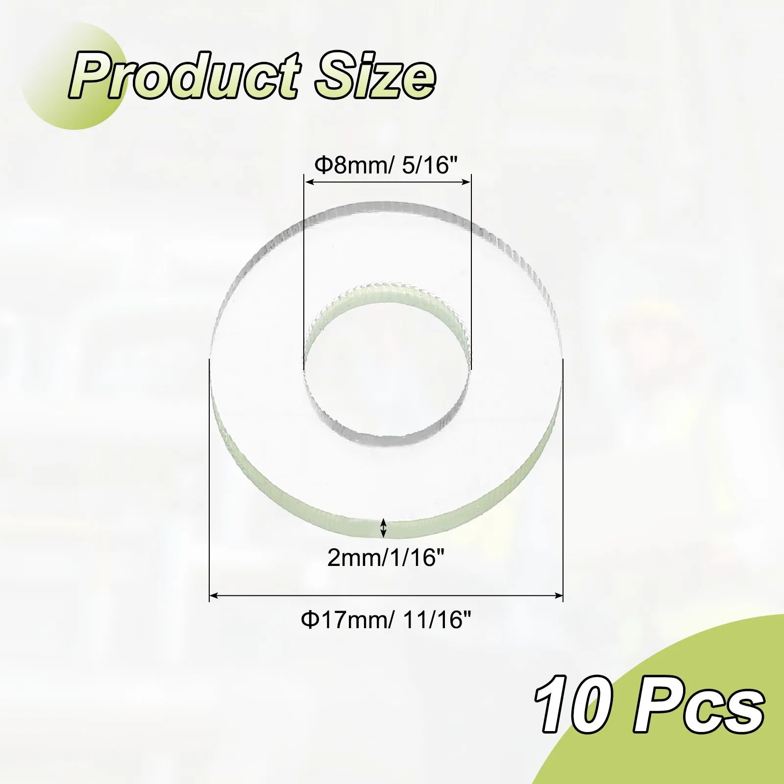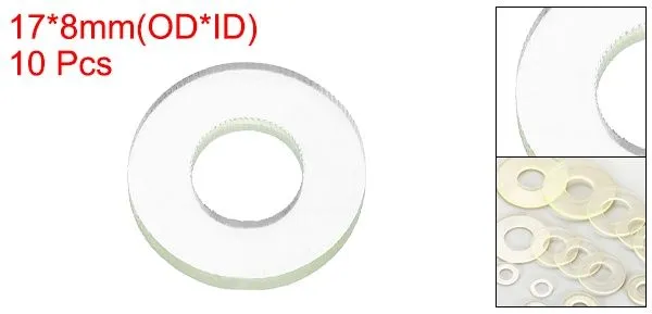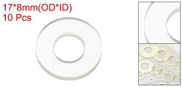 サイズ&パッケージ-材質:ポリウレタン;外径:17mm(約11/16");内径:8mm(約5/16");厚み:2mm(約1/16");パッケージ:PU平座金10個入り。