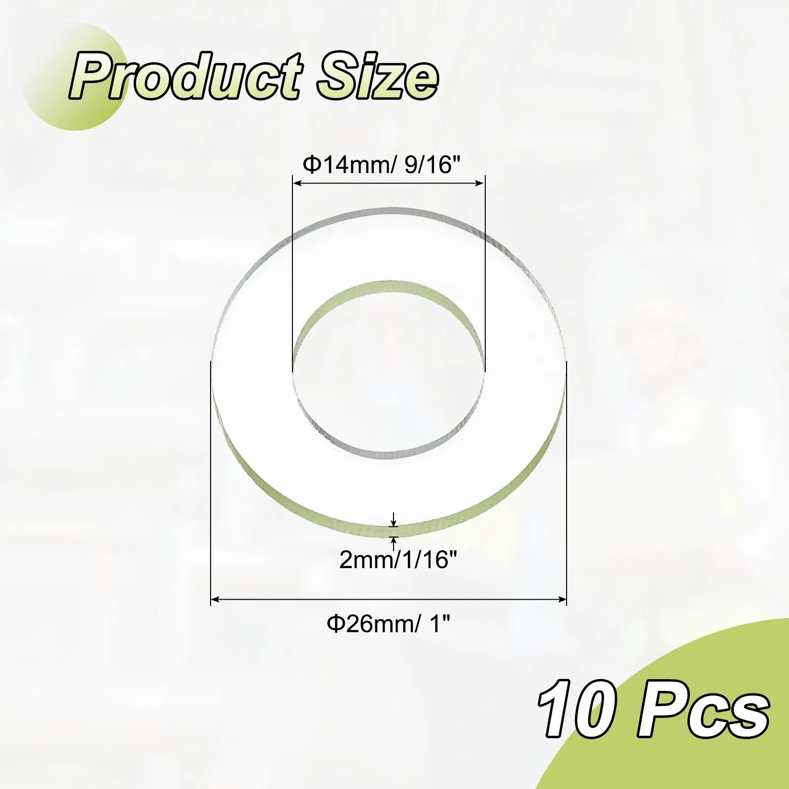 サイズ&パッケージ:外径:26mm/1インチ;内径:14mm/9/16インチ;厚さ:2mm/1/16インチ;内容量:10枚×PU平座金
