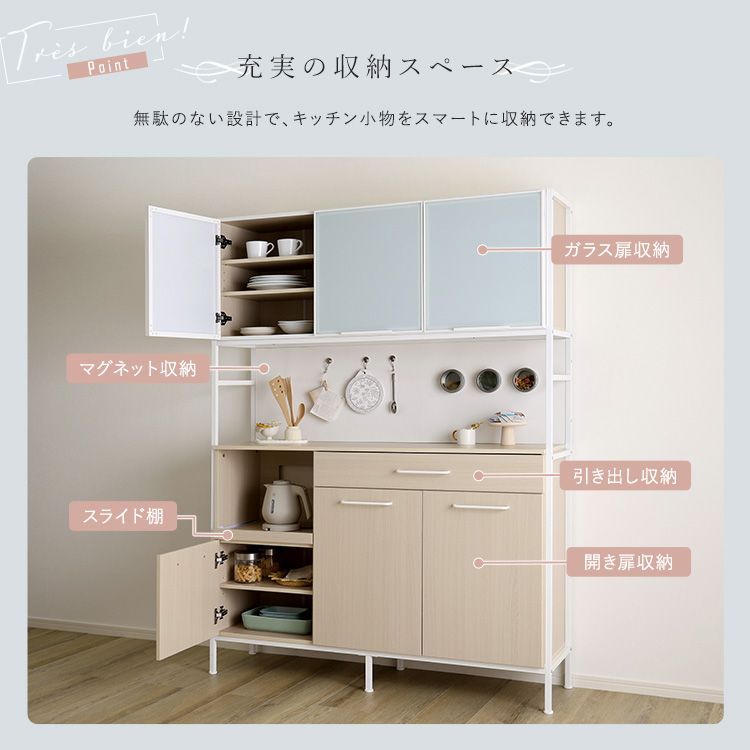 キッチン 収納 さわやかな マグネット ワイド 食器棚 ホワイトガラス かわいい 高級感 幅136.4cm 台所 2口コンセント付き 大容量 おしゃれ 保証