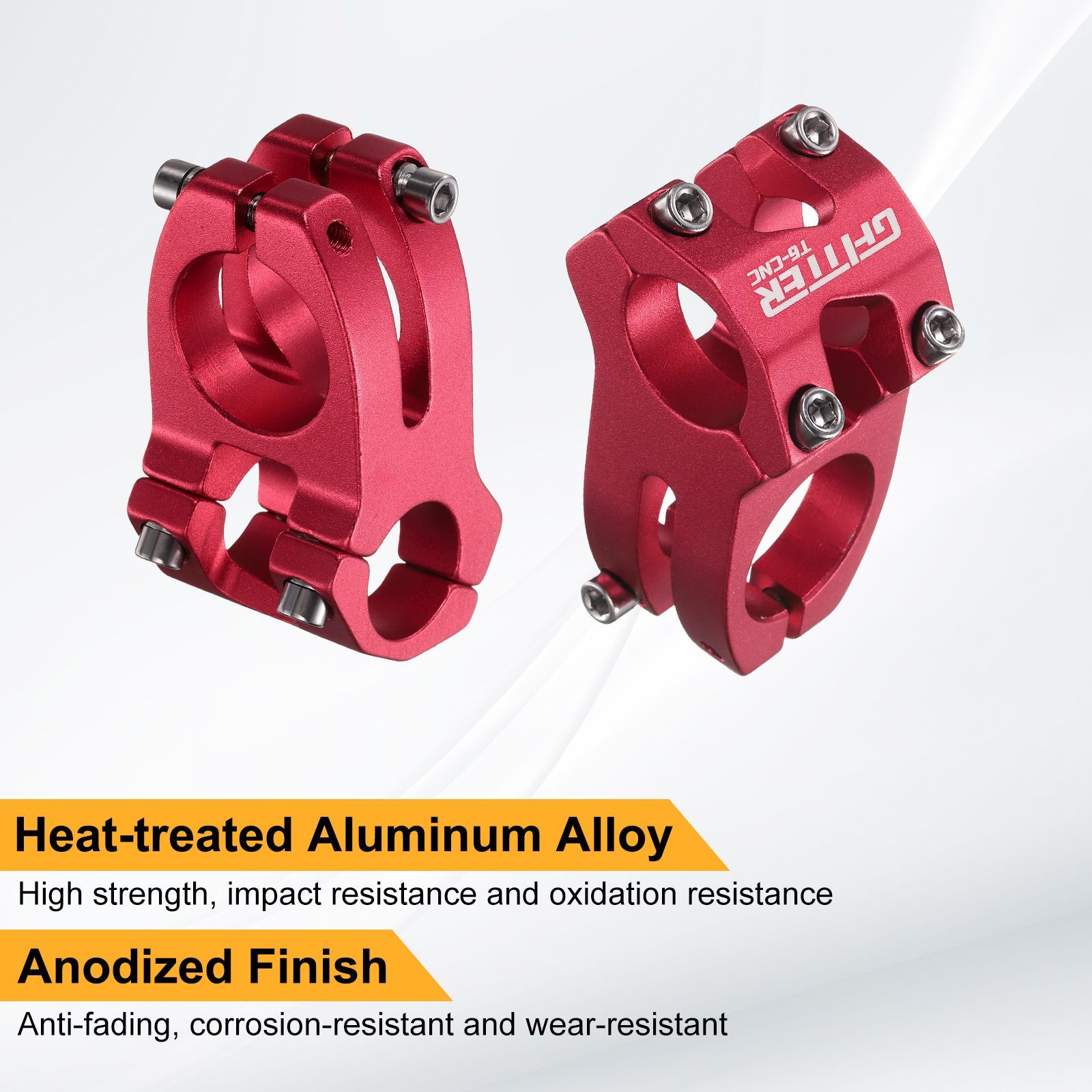 材質 - このマウンテンバイクステムは熱処理されたアルミ合金製で、強度が高く、耐衝撃性、耐腐食性、耐酸化性に優れています。陽極酸化処理された表面は、ステムの耐腐食性と耐磨耗性を効果的に向上させ、光沢を保ち褪せません。