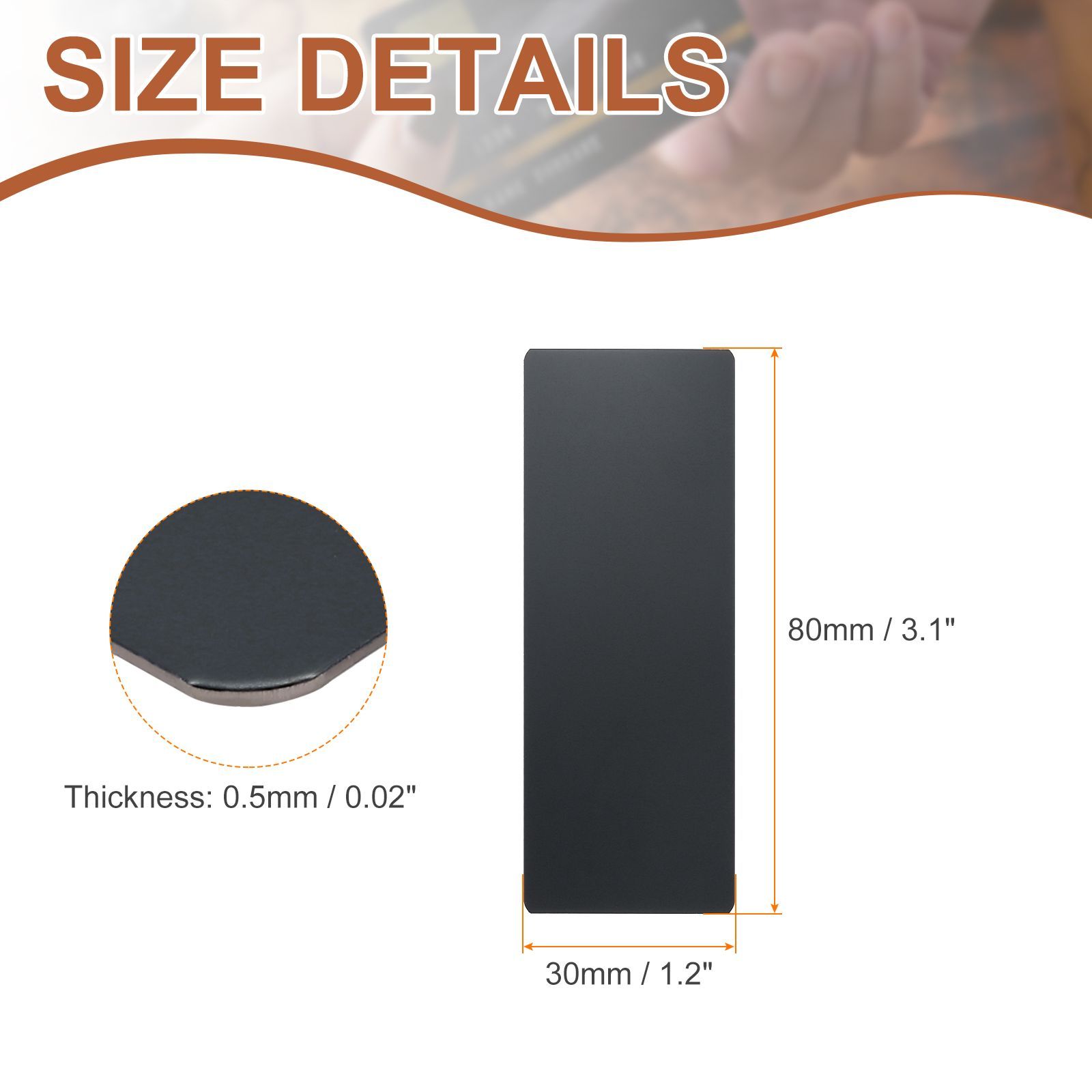 サイズ - 長さ: 80mm / 3.1"; 幅: 30mm / 1.2"; 厚さ: 0.5mm / 0.02"; カラー: 黒。5個の金属名刺は日常のニーズを満たすのに十分であり、サイズは銀行カードのサイズに似ており、ポケットや財布に簡単に入れることができます。