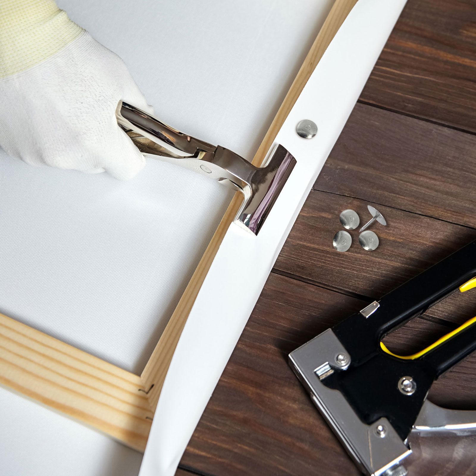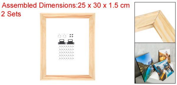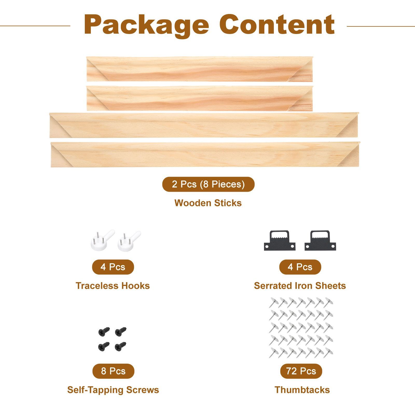 DIYキャンバスストレっチャーバー:DIYキャンバスストレっチャーバーの組み立て寸法は25 x 30 x 1.5 cm / 9.84 x 11.81 x 0.59インチ(長さ×幅×厚さ)で、木製の棒4本、トレースレスフック2本、ギザギザの鉄板2枚、自己攻釘4本、画びょう36本が付属します