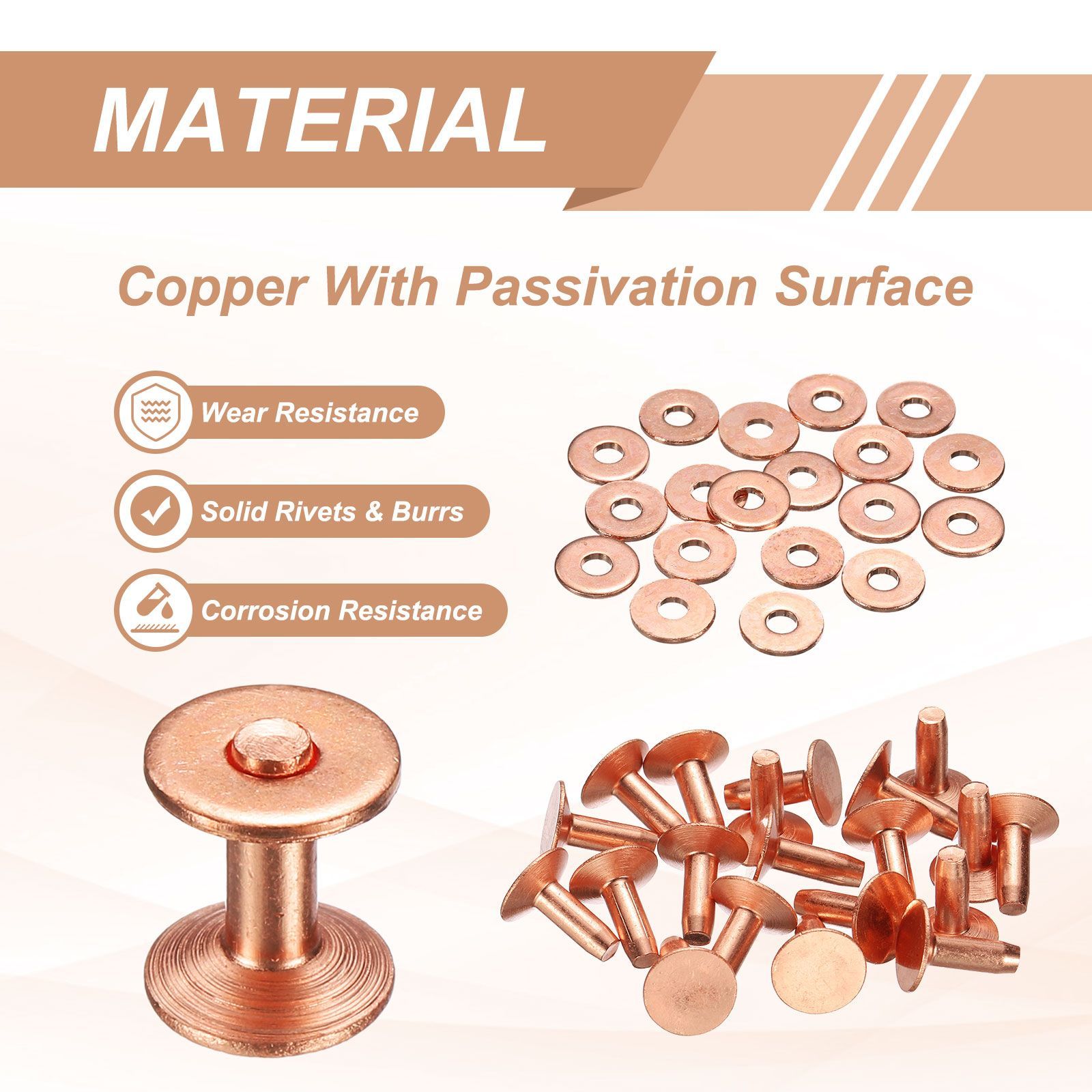 材質-ソリッドリベットセットは銅製で、表面はパッシベーション処理が施されており、耐腐食性、耐磨耗性、優れた耐久性および延性を備え、破損しにくい特性を持っています。付属のワッシャーにより取り付けが強化され、より密着して長期的な強度とサポートを保証します。