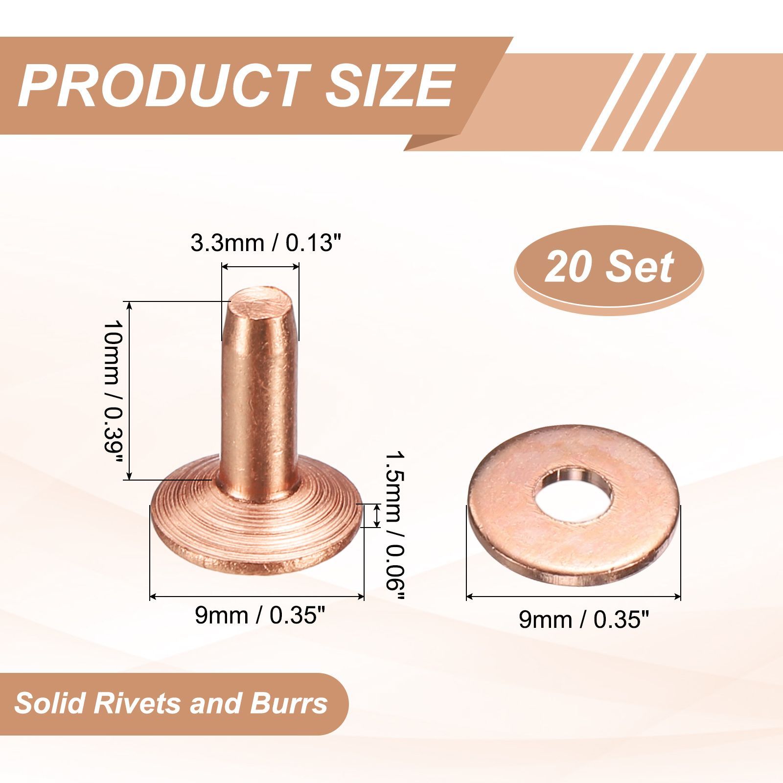 サイズ-銅リベットサイズ:9x3.3x10mm/0.35x0.13x0.39インチ(外径*直径*高さ);頭部厚さ:1.5mm/0.06インチ。