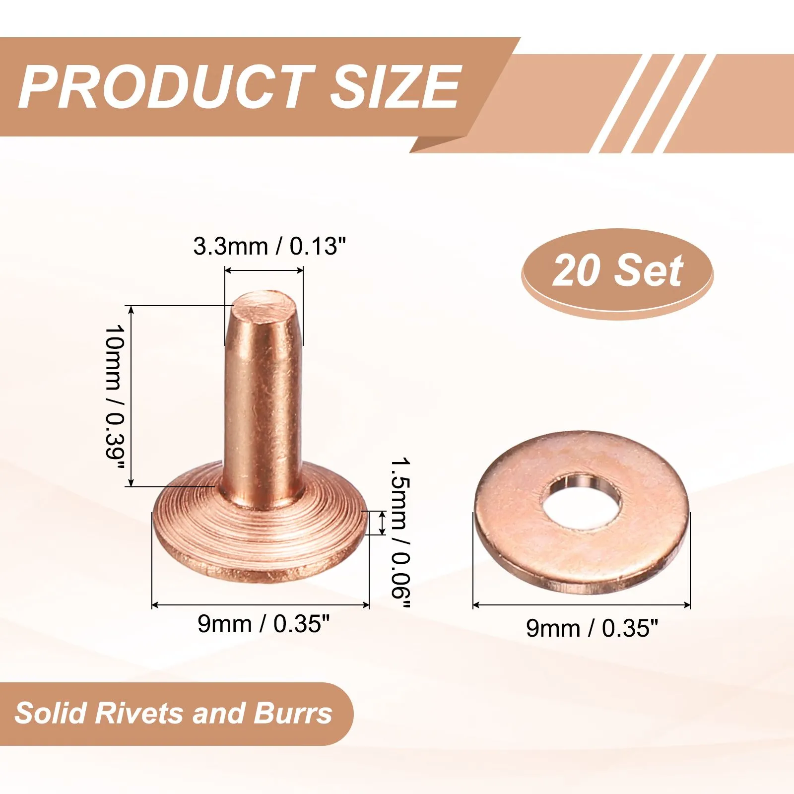 uxcell 20セット 銅リベットとバーワッシャー 9x3.3x10mm ポリッシュ仕上げ ソリッドレザーリベットファスナー スタッド ポスト レザーDIYクラフト ベルト 財布 カラー用 銅トーン