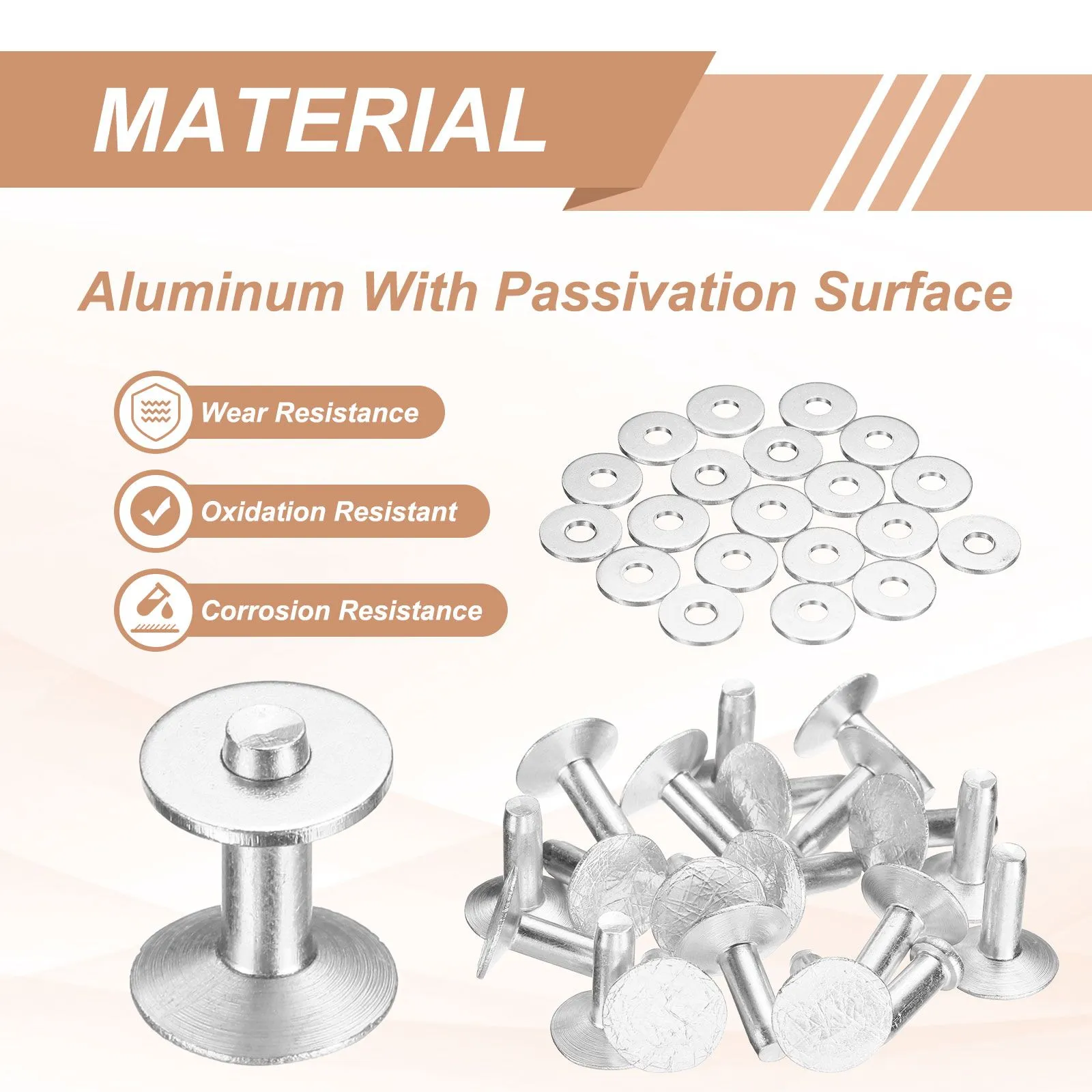 材質-ソリッドリベットセットはアルミニウム製で表面は不動態処理済みです。耐腐食性、耐磨耗性、優れた耐久性および延性を備え、破損しにくい設計です。付属のワッシャーは取り付けを強化し、より密着したフィットを提供するため、長持ちする強度とサポートを確保します。特徴: