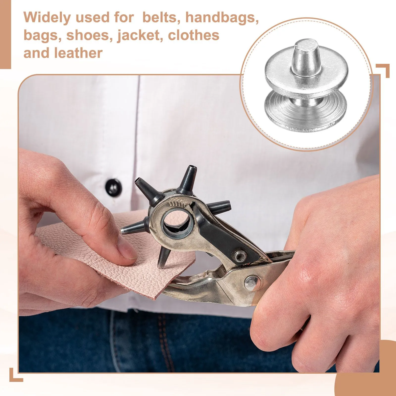 注意:レザーリベットを取り付ける際には、安全で確実な固定のため適切な工具と方法を使用するよう注意してください。キーワード: