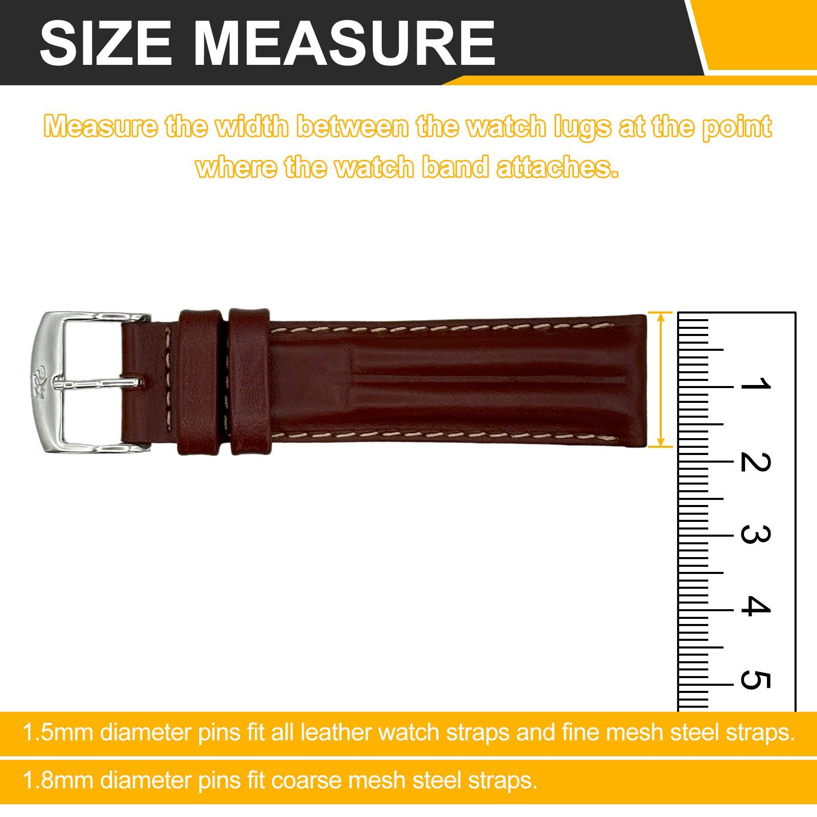 注意-時計バンドが取り付けられる部分のラグ間の幅を測定してください。これは時計バンドの取り付け幅でもあります。直径1.5mmのピンは全ての革製バンドと細かいメッシュのステールバンドに直径1.8mmのピンは粗いメッシュのステールバンドに適合します