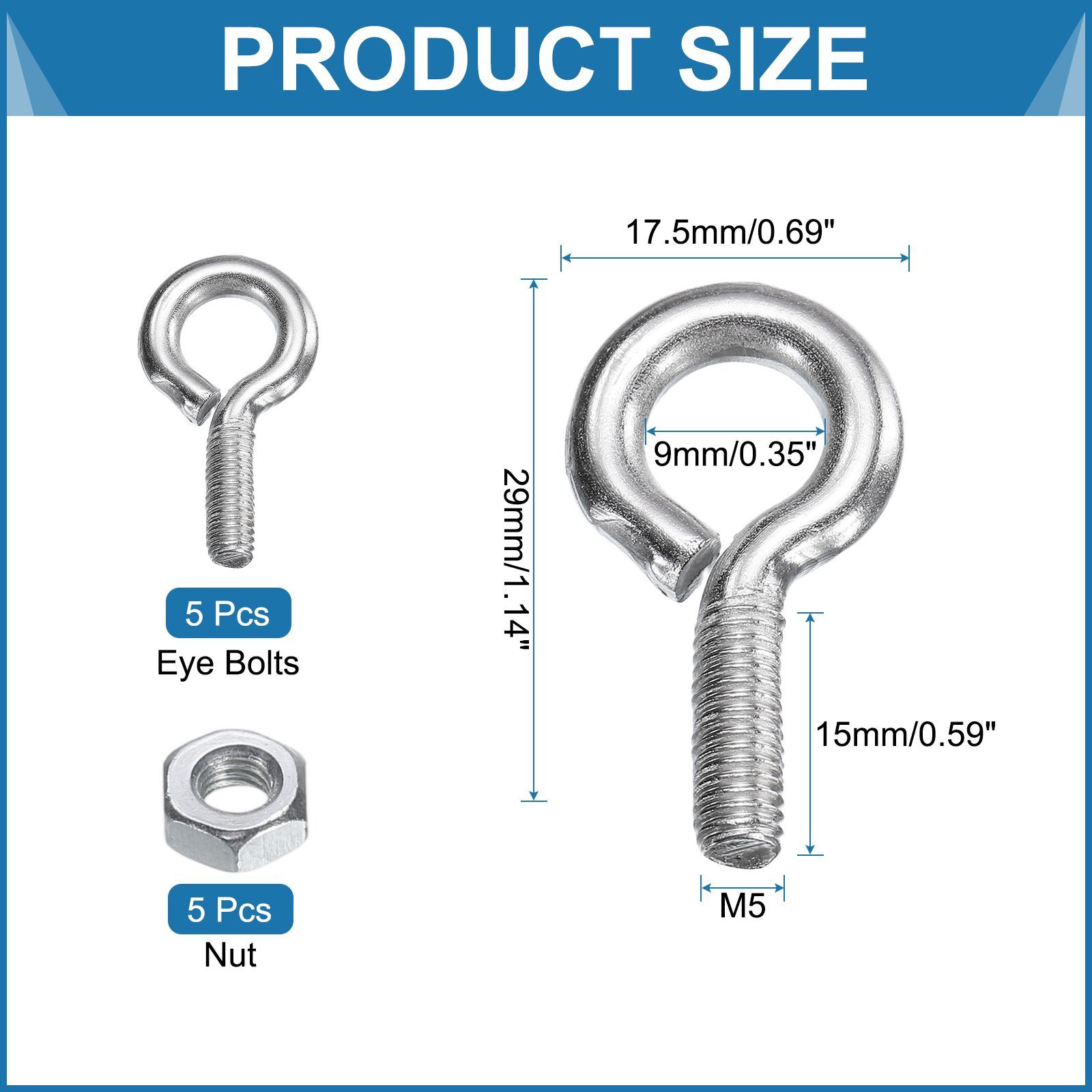 ねじサイズ:M5x15mm(D*L)、穴内径:9mm/0.35インチ、穴外径:17.5mm/0.69インチ、全長:34mm/1.34インチ。パッケージ内容:アイボルトとナット各5個