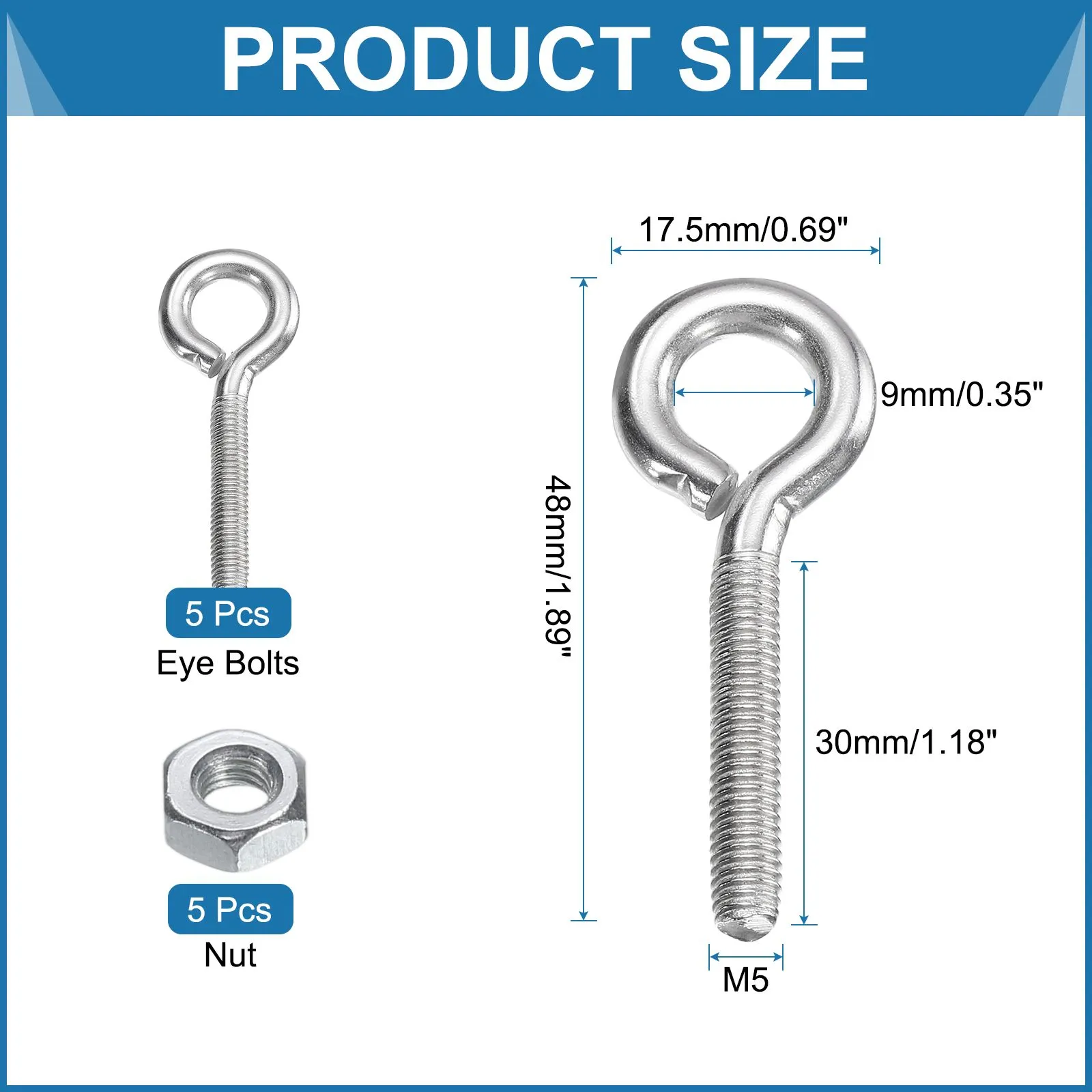 ネジサイズ:M5×30mm(径×長)穴内径:9mm/0.35インチ穴外径:17.5mm/0.69インチ全長:48mm/1.89インチ内容物:アイボルト5個ナット5個