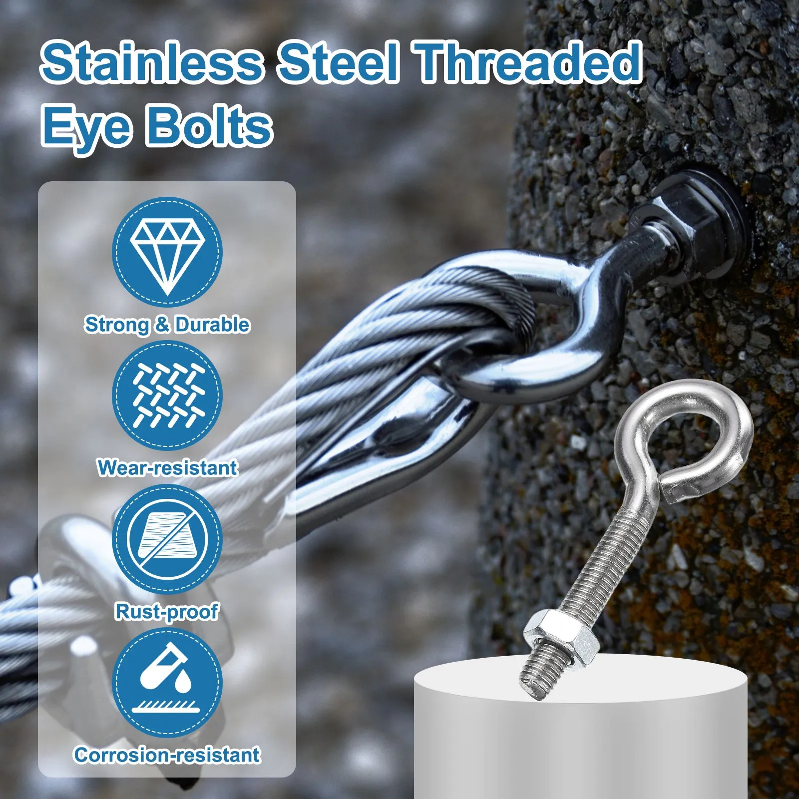 材質:ネジ付きアイボルトは高強度304ステンレス鋼製で耐久性錆防止耐磨耗性耐腐食性に優れ湿気のある環境でも使用可能褪色や滑りにくい