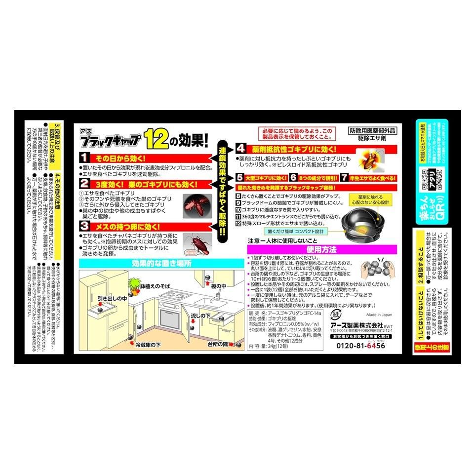 【アースブラックキャップ12の効果】連鎖効果ですばやく駆除! ! (1)その日から効く! ・置いたその日から効果が現れる速効成分フィプロニルを配合。 ・エサを食べたゴキブリを速効駆除。 (2)3度効く! 巣のゴキブリにも効く! 1:エサを食べたゴキブリ 2:そのフンや死骸を食べた巣のゴキブリ 3:さらに外から侵入してきたゴキブリ ・巣の中の幼虫や他の成虫もすばやく巣ごと駆除。 (3)メスの持つ卵に効く! ・エサを食べたチャバネゴキブリが持つ卵にも効く。※抱卵初期のメスに対しての効果 ・ゴキブリの卵から成虫までトータルに効きめを発揮。 (4)薬剤抵抗性ゴキブリに効く! ・薬剤に対し抵抗力を持ったしぶといゴキブリにもしっかり効く。※ピレスロイド系抵抗性ゴキブリ (5)大型ゴキブリに効く! (6)8つの成分で誘引! (7)半生エサでよく食べる! 「優れた効きめを発揮するブラックキャップ容器! 」 (8)たくさん置くことでゴキブリの駆除効果がアップ。 (9)ブラックドームの暗闇でゴキブリが警戒しにくい。 (10)ゴキブリに適度なすき間で入りやすい。 (11)360度のマルチエントランスでどこからでも誘い込む。 (12)特殊スロープ形状でエサまで誘い込む。 ・置くだけ簡単コンパクト設計 ・薬剤に触れる心配のない設計 ※リニューアルに伴い、パッケージ・内容等予告なく変更する場合がございます。予めご了承ください。
