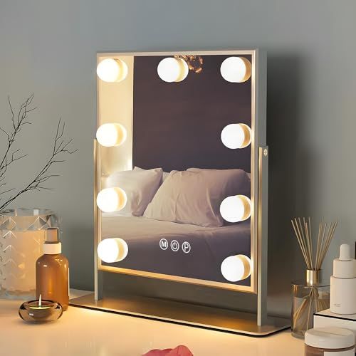 FENCHILIN 女優ミラー 卓上鏡 ハリウッドミラー 9個LED電球付き 10倍拡大鏡付き 三色照明モード 明るさ調節可能 360度回転 給電式(ホワイト)so