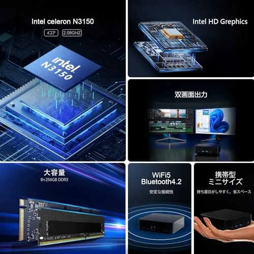 ミニPC N3150 miniPC 高速 DDR3 8GB+256GB 4コア/4スレッド 最大2.08GHz VESA対応 静音性 有線LANポート付き 静音性 小型デスクトップ ミニパソコンso