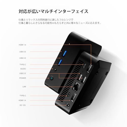【高速データ転送・多機能ポート】VESA対応が可能で、簡単な接続が可能であり、高速なデータ転送が実現します。Mini PCはTYPE-Cx2、HDMIx2、USB3.0x2、USB2.0x2、LANx1、1つの3.5mmオーディオ入力、および1つのDC電源入力を備えています。1000Mブロードバンドで最大128MB/sまでダウンロードスピードをサポートし、オフィスやデザイン、ホームビデオなどのソフトウェアニーズに最適です。