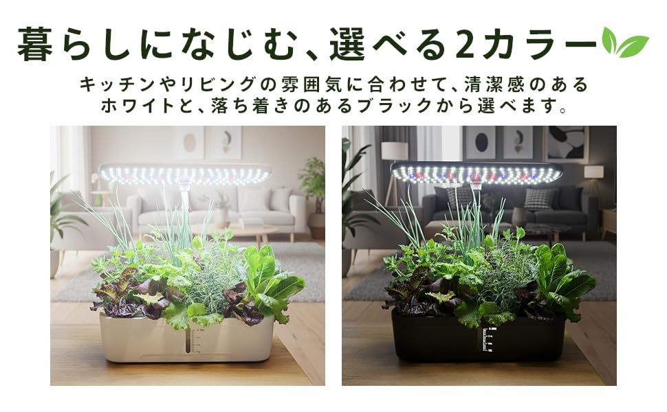 自動機能で快適 水や光の管理は全自動で、初心者でも安心。ライトはタイマー付きで就寝中も快適に過ごせます。手間をかけずに植物に最適な環境を保てる。忙しい方でも続けやすく、無理なく家庭菜園を楽しめます。